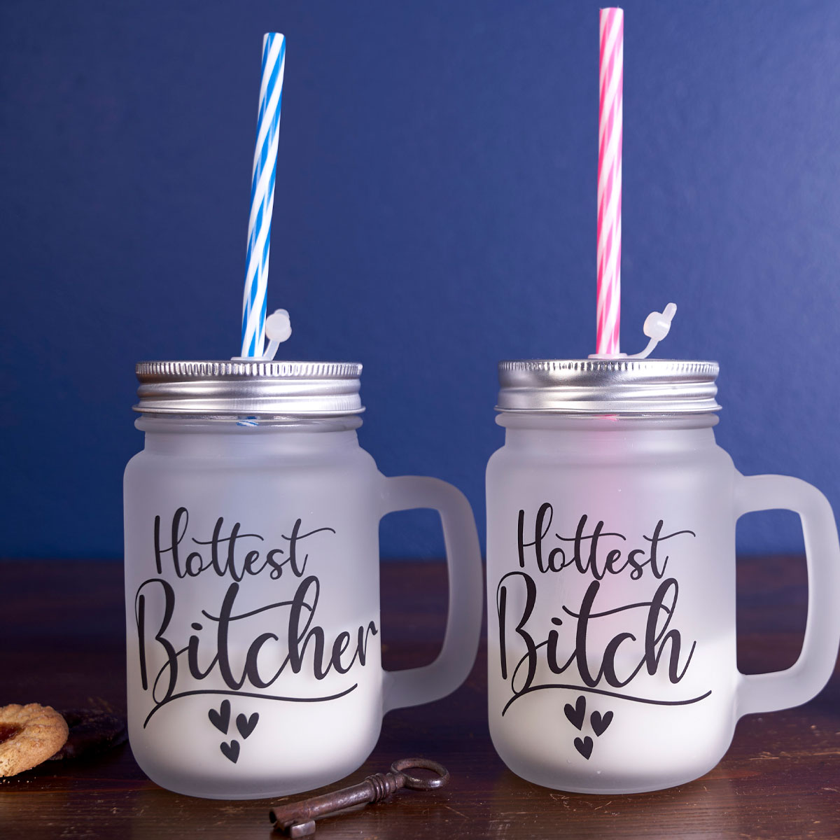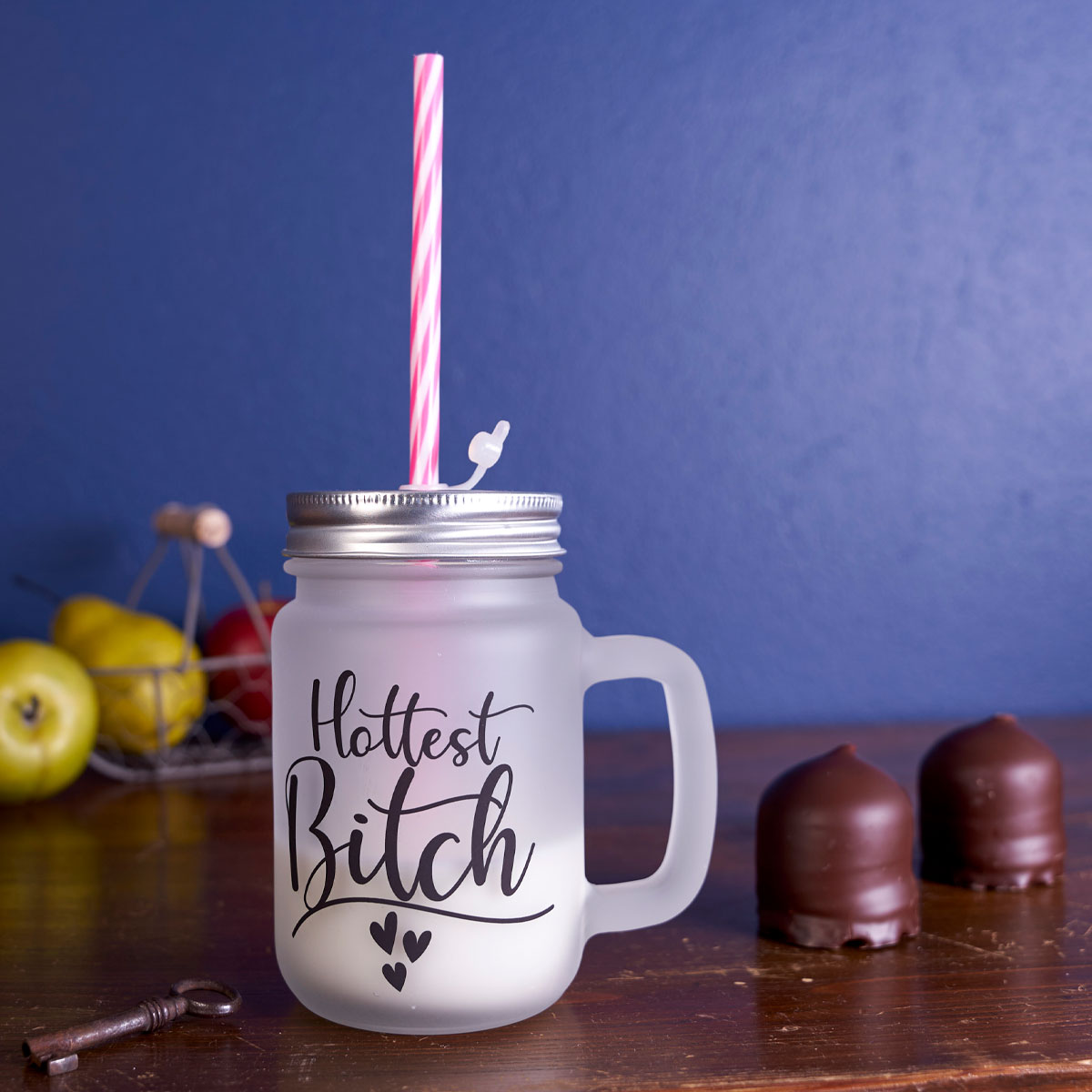 Henkelglas mit Deckel und Trinkhalm, bedruckt,