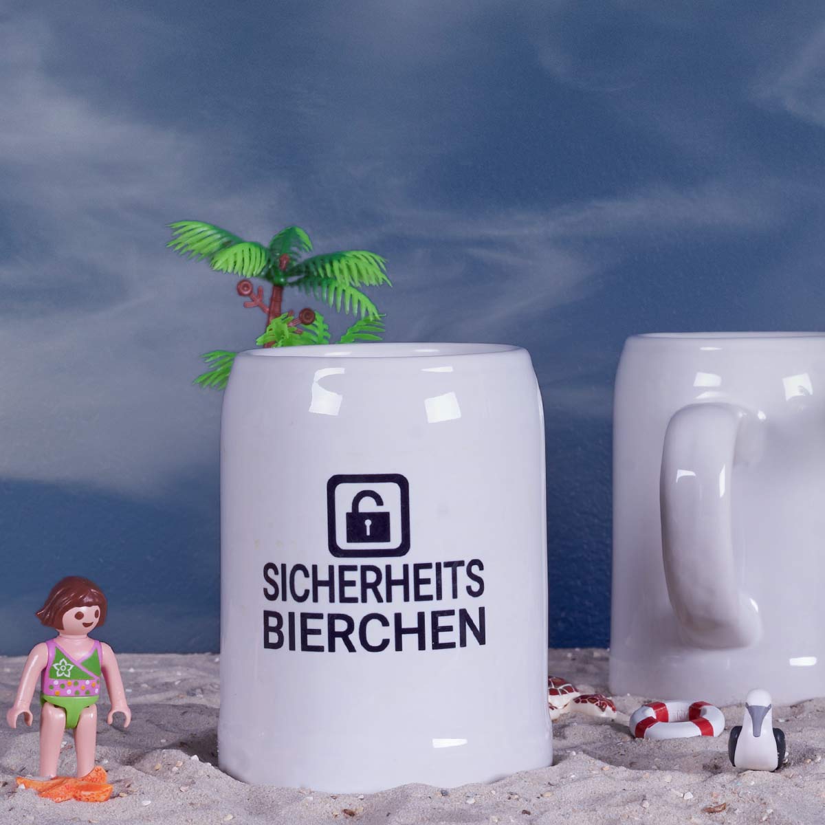 Kleiner Bierkrug, weiß, bedruckt, Motiv ” Sicherheits Bierchen”