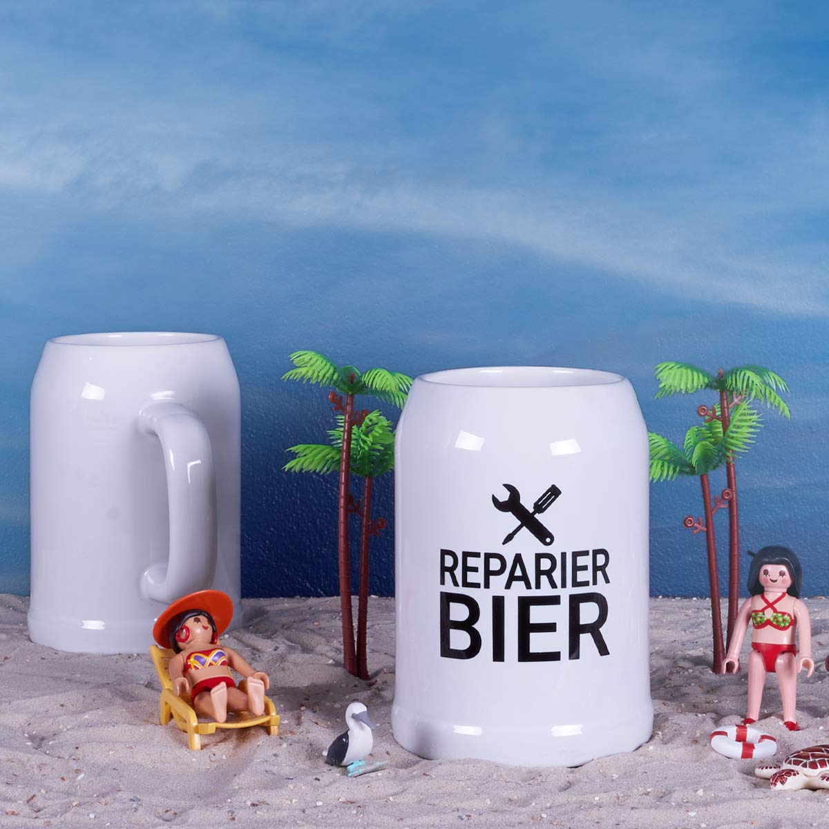 Bierkrug, weiß, bedruckt, Motiv ” Reparier Bier”