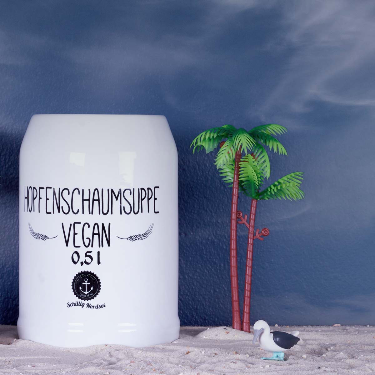 Bierkrug, weiß, bedruckt, Motiv ” Land’s End Hopfenschaumsüppchen”