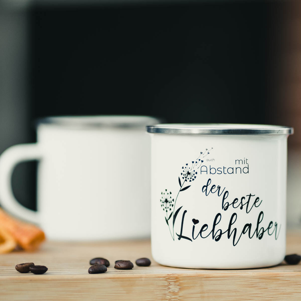 Emaille-Tasse weiß, 12oz, mit silbernem Edelstahlrand, bedruckt,