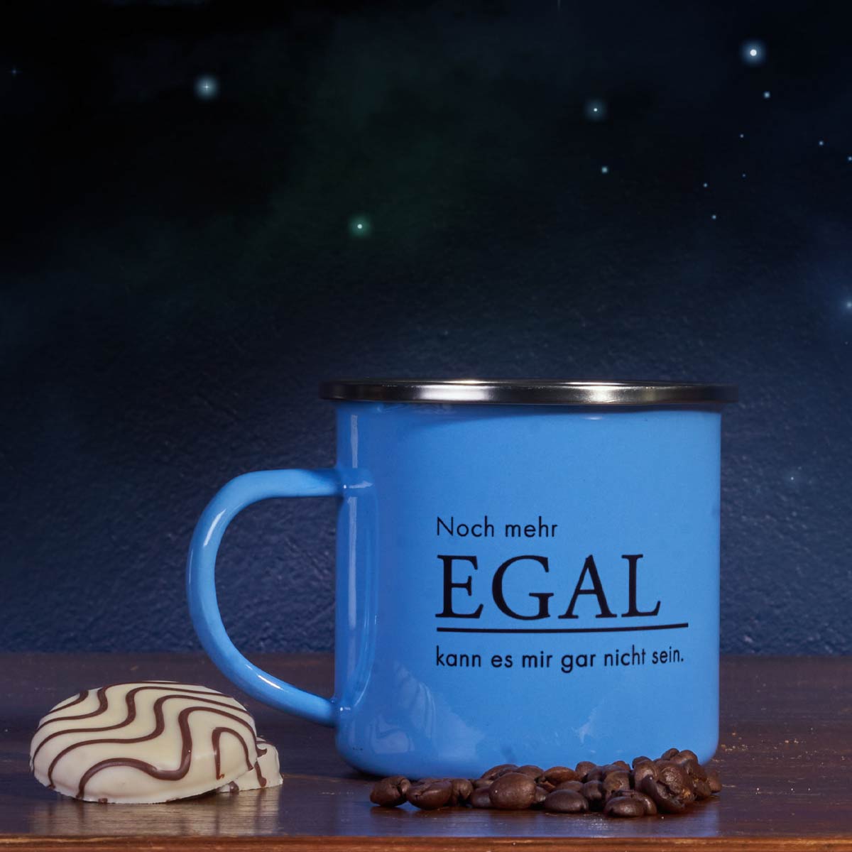 Emaille-Tasse blau, 12oz, mit silbernem Edelstahlrand, bedruckt, Motiv “EGAL”