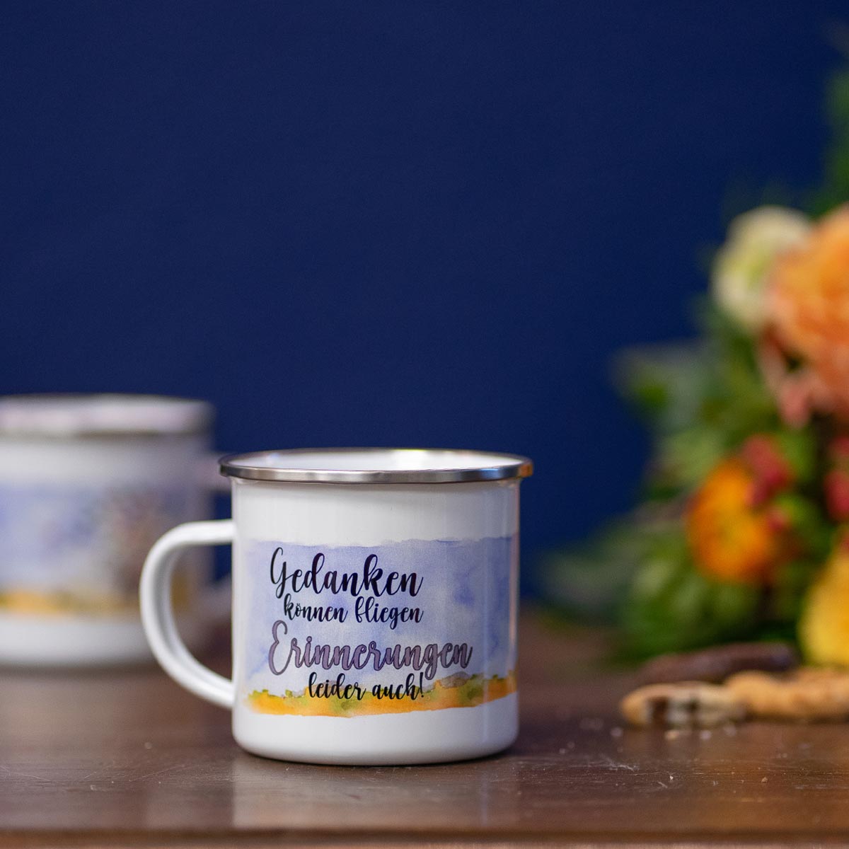 Emaille-Tasse weiß, 12oz, mit silbernem Edelstahlrand, bedruckt,