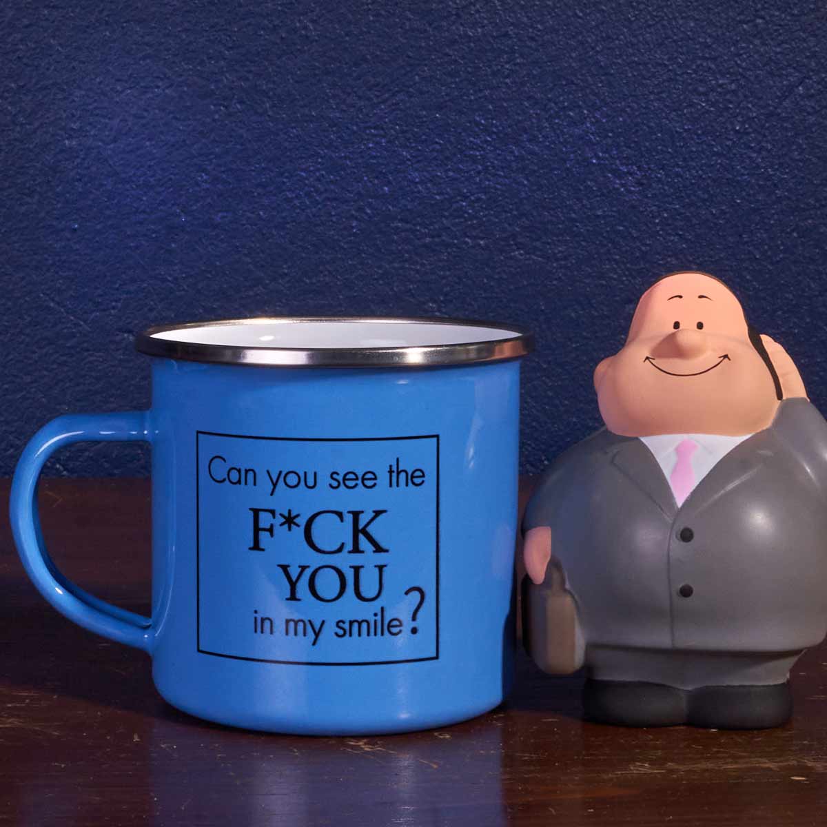 Emaille-Tasse blau, 12oz, mit silbernem Edelstahlrand, bedruckt, Motiv “F*CK YOU”
