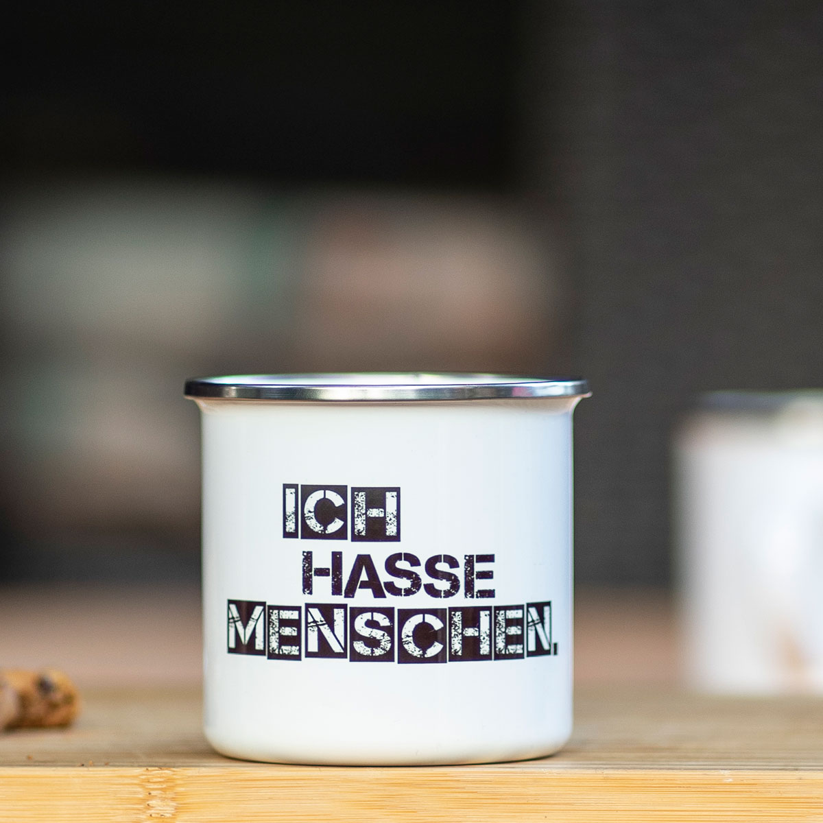 Emaille-Tasse weiß, 12oz, mit silbernem Edelstahlrand, bedruckt, Motiv “ich hasse Menschen”