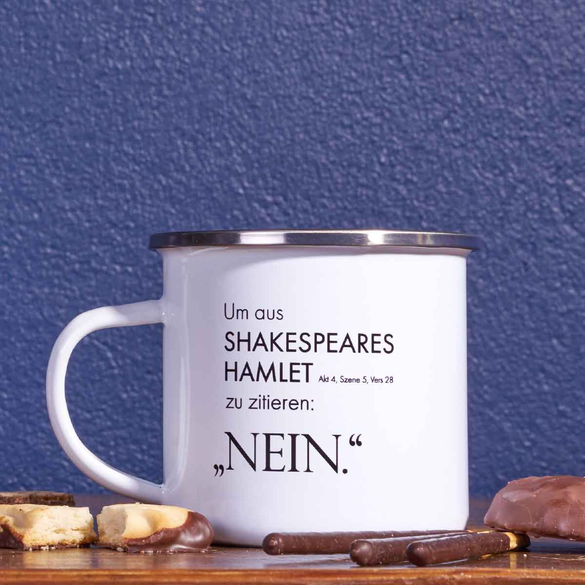 Emaille-Tasse weiß, 12oz, mit silbernem Edelstahlrand, bedruckt, Motiv “NEIN”
