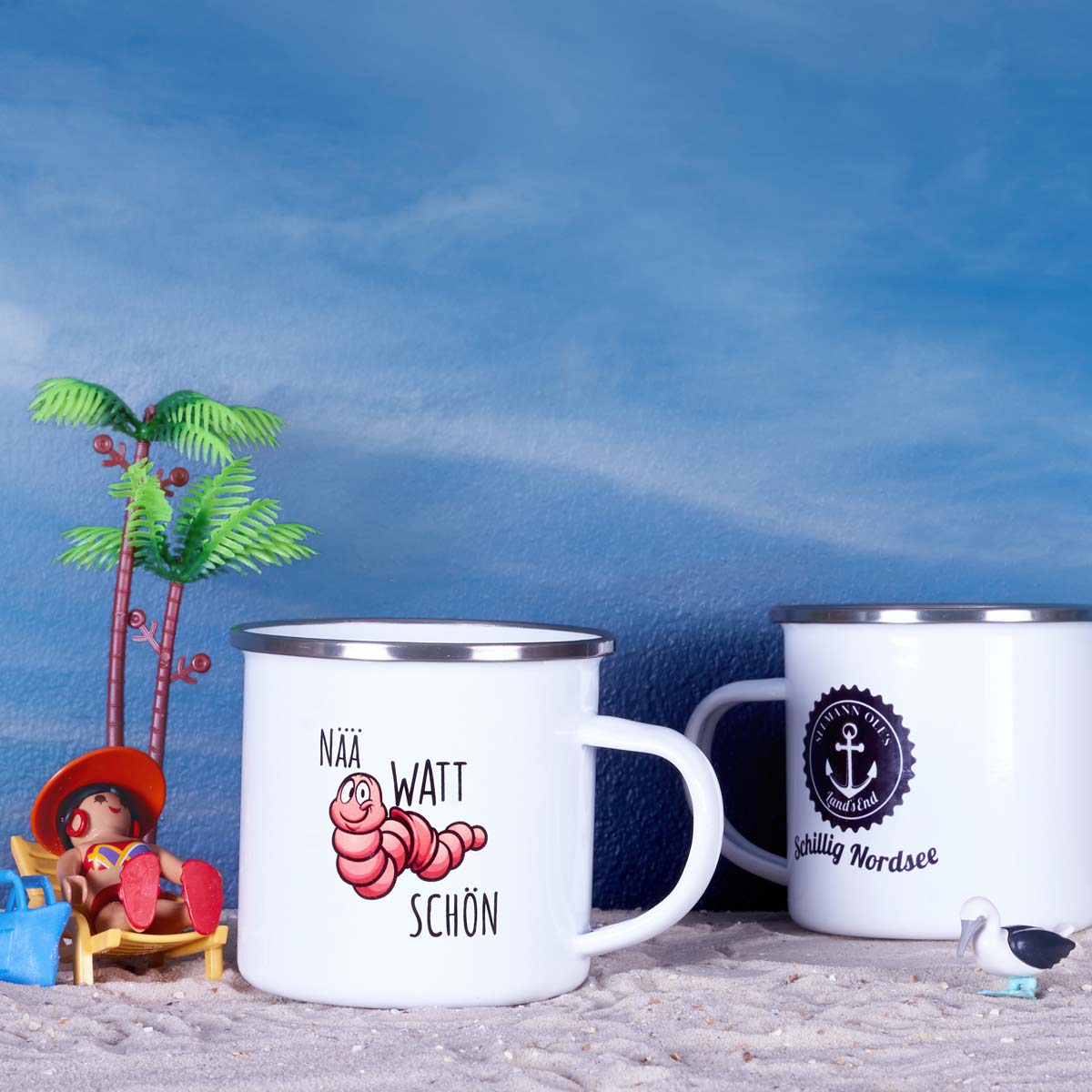 Emaille-Tasse weiß, 12oz, mit silbernem Edelstahlrand, bedruckt, Motiv “Land’s End – Wat schön”