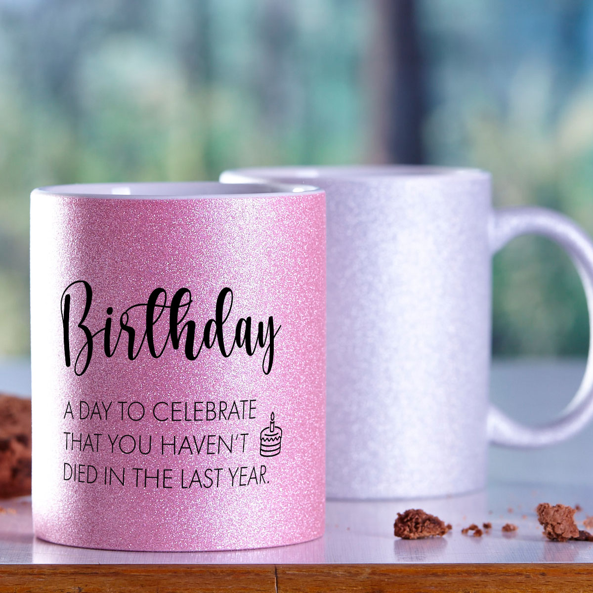 Glitzertasse, pink, bedruckt, Motiv “Birthday”