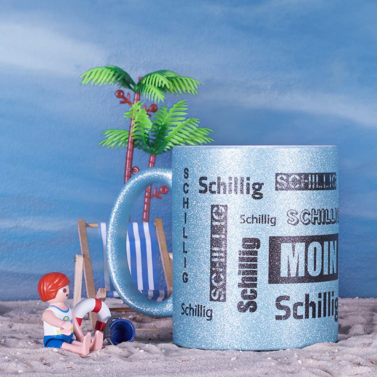 Glitzertasse, Light Blue, bedruckt, Motiv “Land’s End – Moin”