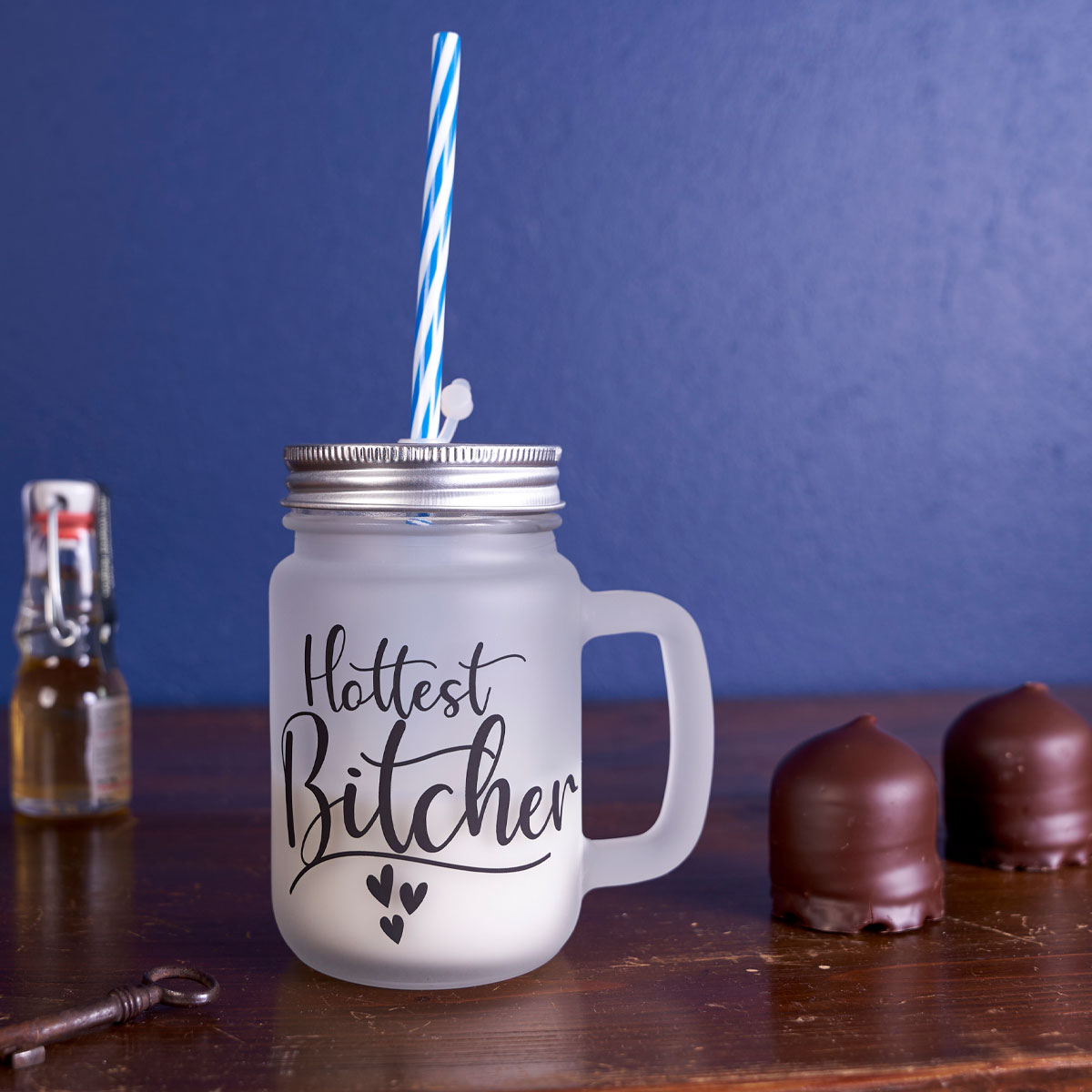 Henkelglas mit Deckel und Trinkhalm, bedruckt,